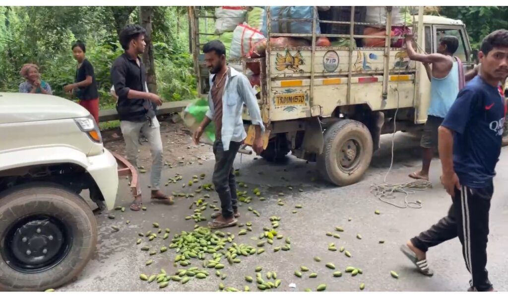 The situation escalated when enraged vegetable sellers threw their produce onto the road in a dramatic display of anger. The protest brought traffic on the National Highway to a standstill, creating chaos in the area.